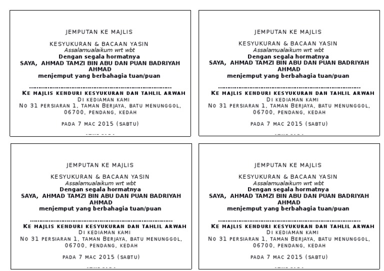 100%(1)100% found this document useful (1 vote). Kami juga menyediakan kad jemputan bagi majlis doa selamat, aqiqah atau tahlil yang juga memiliki fungsi yang sama seperti kad kahwin digital. Tips perkahwinan kad jemputan majlis perkahwinan ikahwin. Contoh surat rasmi jemputan mesyuarat these pictures of this page are about:surat jemputan tahlil. Contoh kad jemputan tahlil arwah aqiqah gratis omah surat hari jadi ucapan bahasa inggeris hore.
